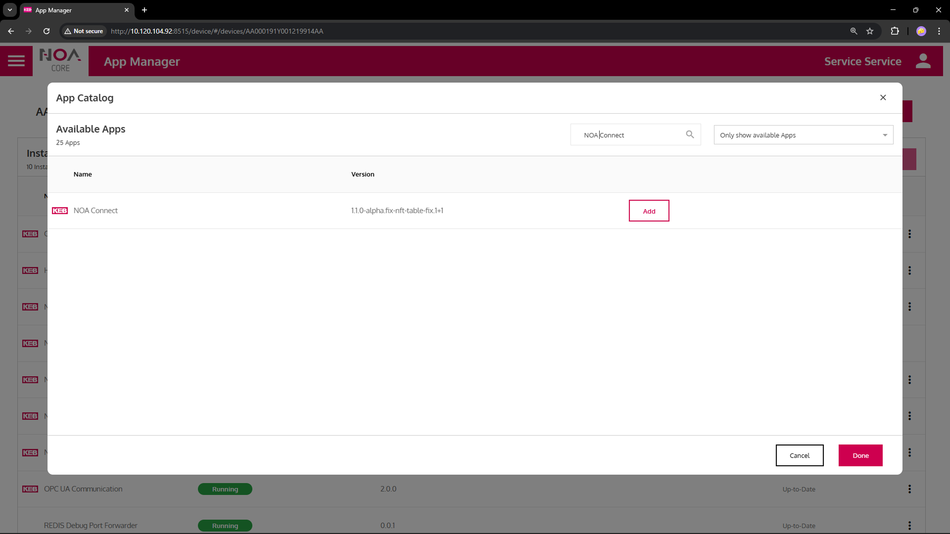 Open the App Manager on the edge device. Click the button "Add New Apps", locate "NOA Connect", then click "Add" + "Done"; then apply changes + confirm.