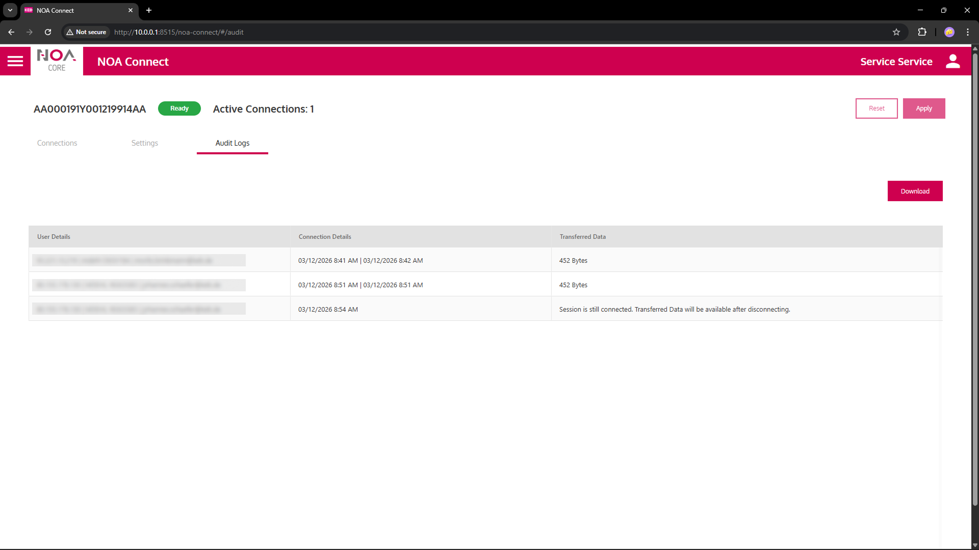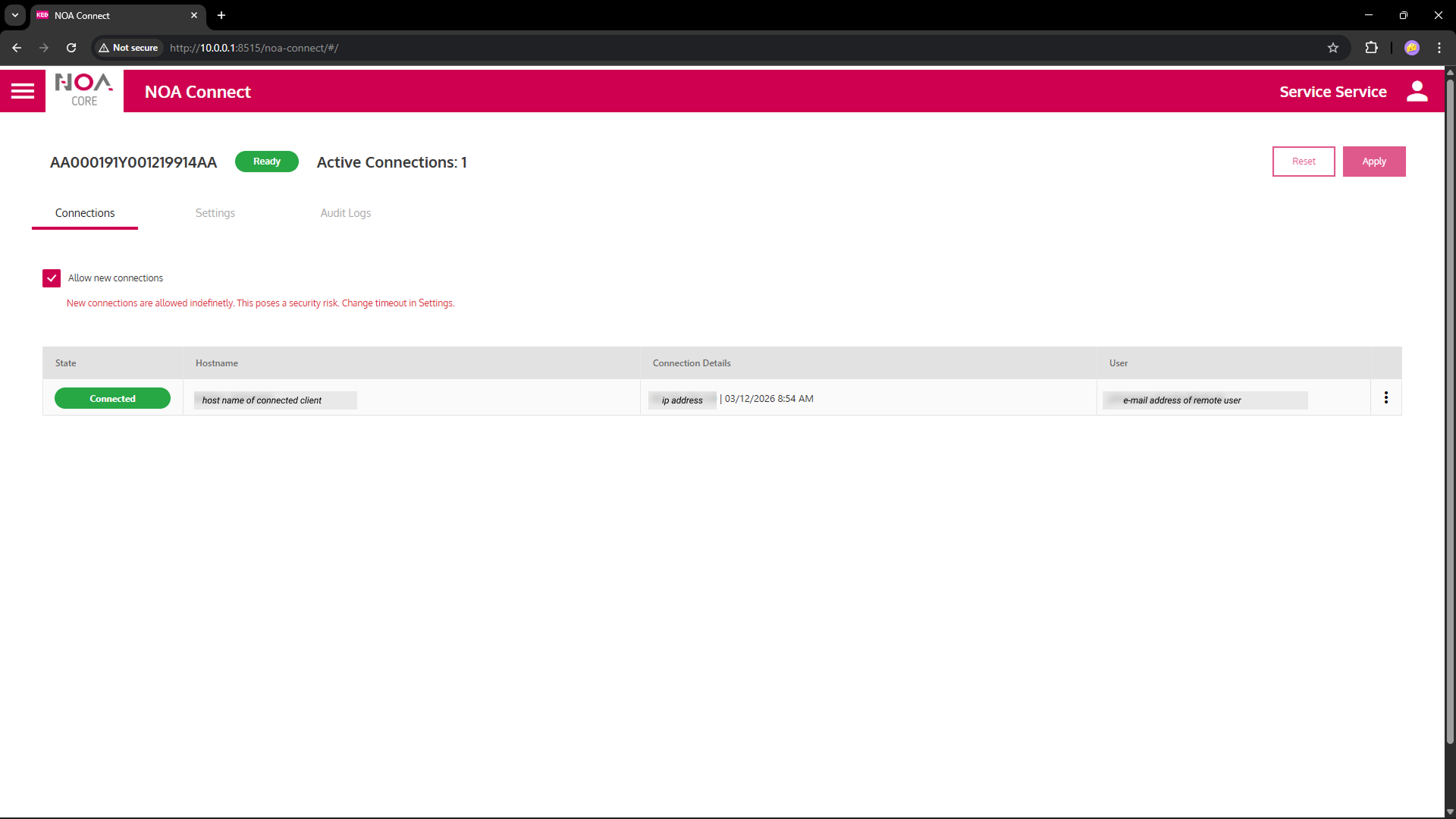 Remote AccessIn this example the NOA Connect app was opened via an active remote connection (see URL).