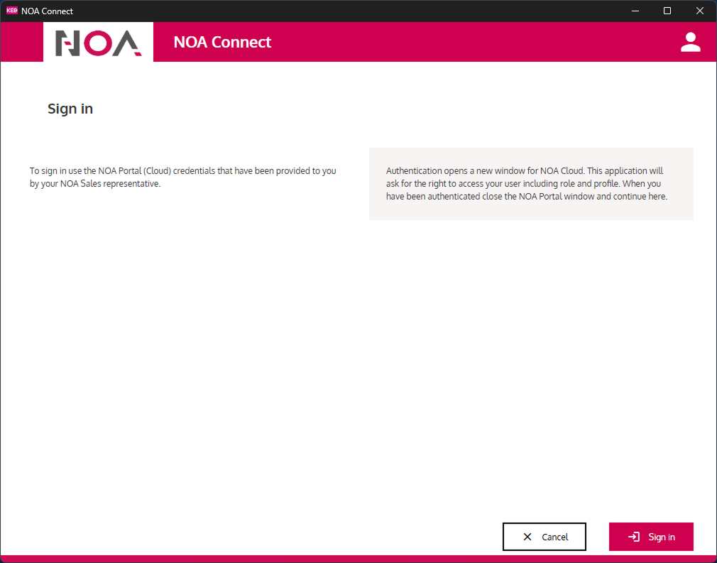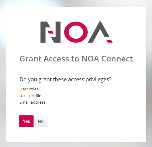 Sign in From the first screen use "Sign in". This will open a browser window and asks for your NOA Portal credentials. After sign in: grant access to the user information. After you confirm, you can close the browser window and continue in the client.