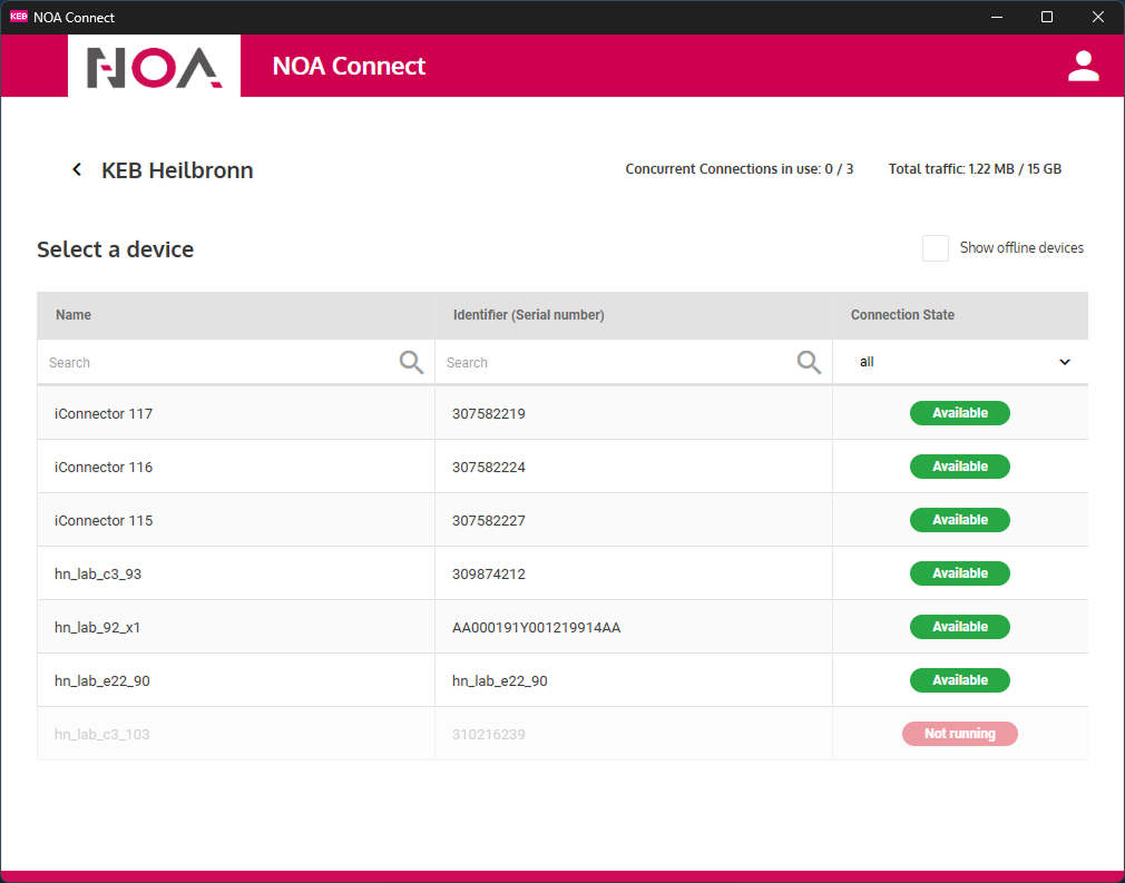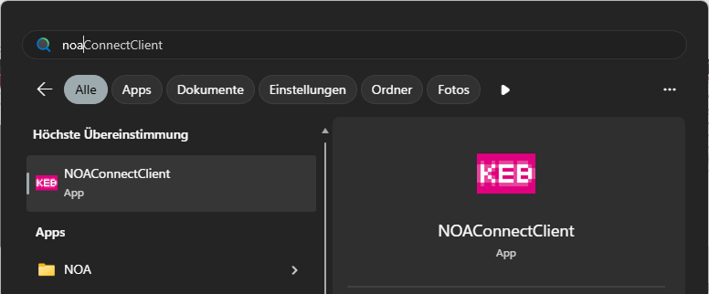 Click in the tile "NOA Connect" to open the app. The current connection is shown in the list of active connections.