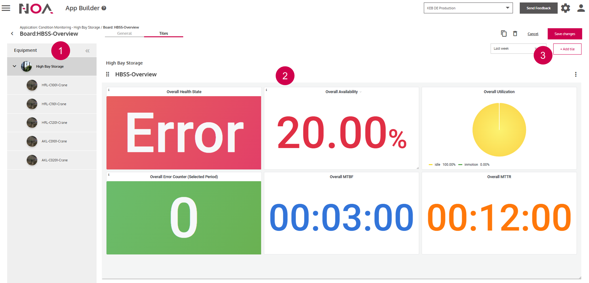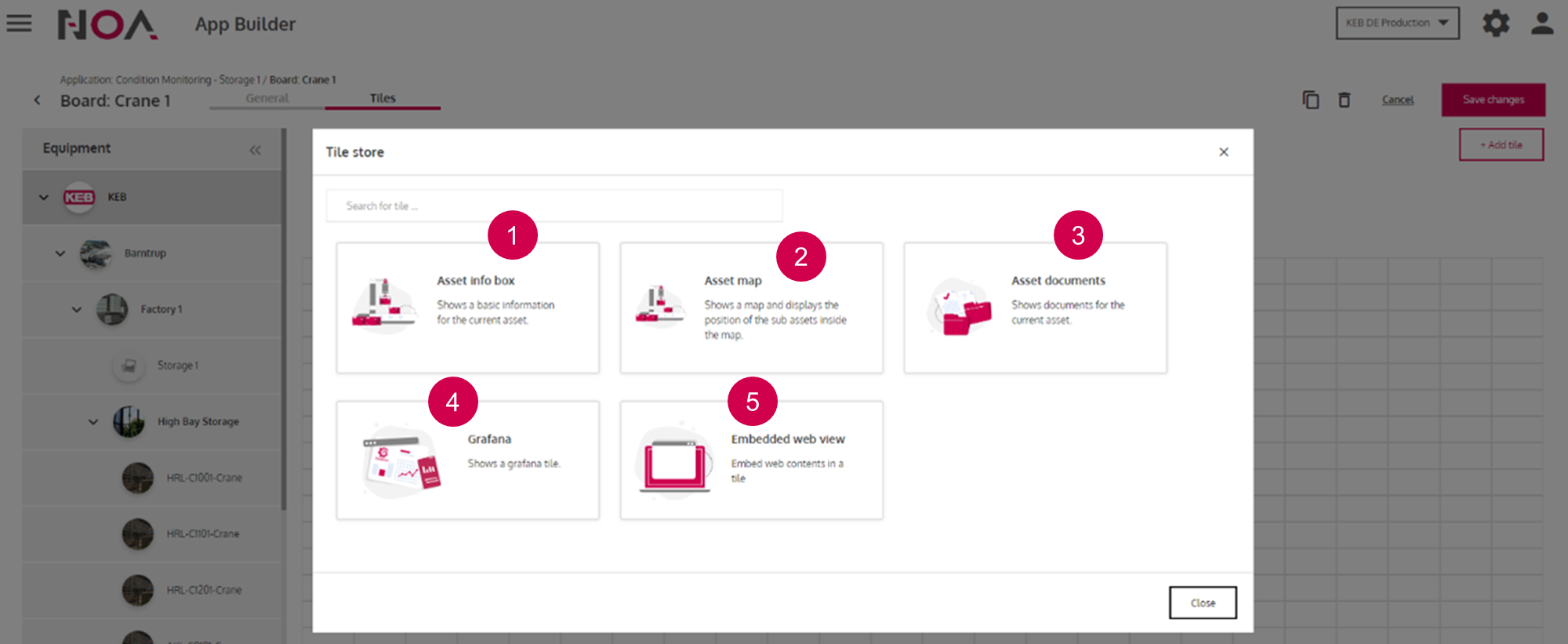 ReferenceApp BuilderTiles TabOn this pageTiles Tab About Move to Tiles Tab to add content to your Board. Anatomy Selected Assets for your DashboardGrid to place TilesAdd a new Tile to the grid Tiles Store Select the type of Tile that you want to add in the Tile Store dialog. Info of your AssetLocation viewDisplay documentsDisplay Device dataDisplay a website