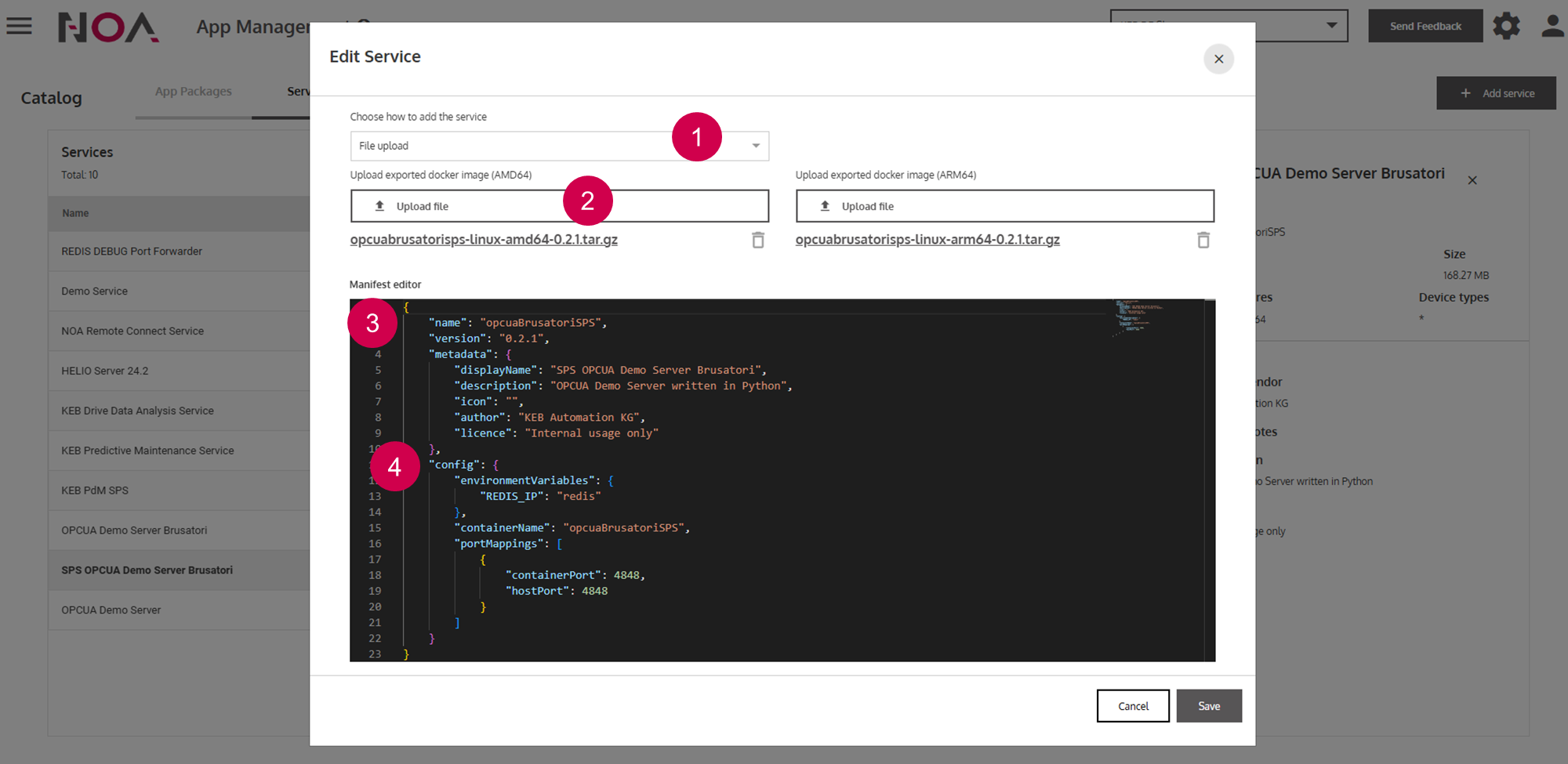 ReferenceApp CatalogServicesService DetailsOn this pageService Details About When adding a new Service, the Manifest editor opens up. Here, you need to specify properties of your Service, e.g. the displayed name. An example Manifest is posted below that you can use as a template when adding your Service. Anatomy Select between File upload (local Docker Image) or pulling the Docker Image from a registryUpload Docker ImageSpecify name and version of ServiceSpecify config parametersPress Save to create the Service