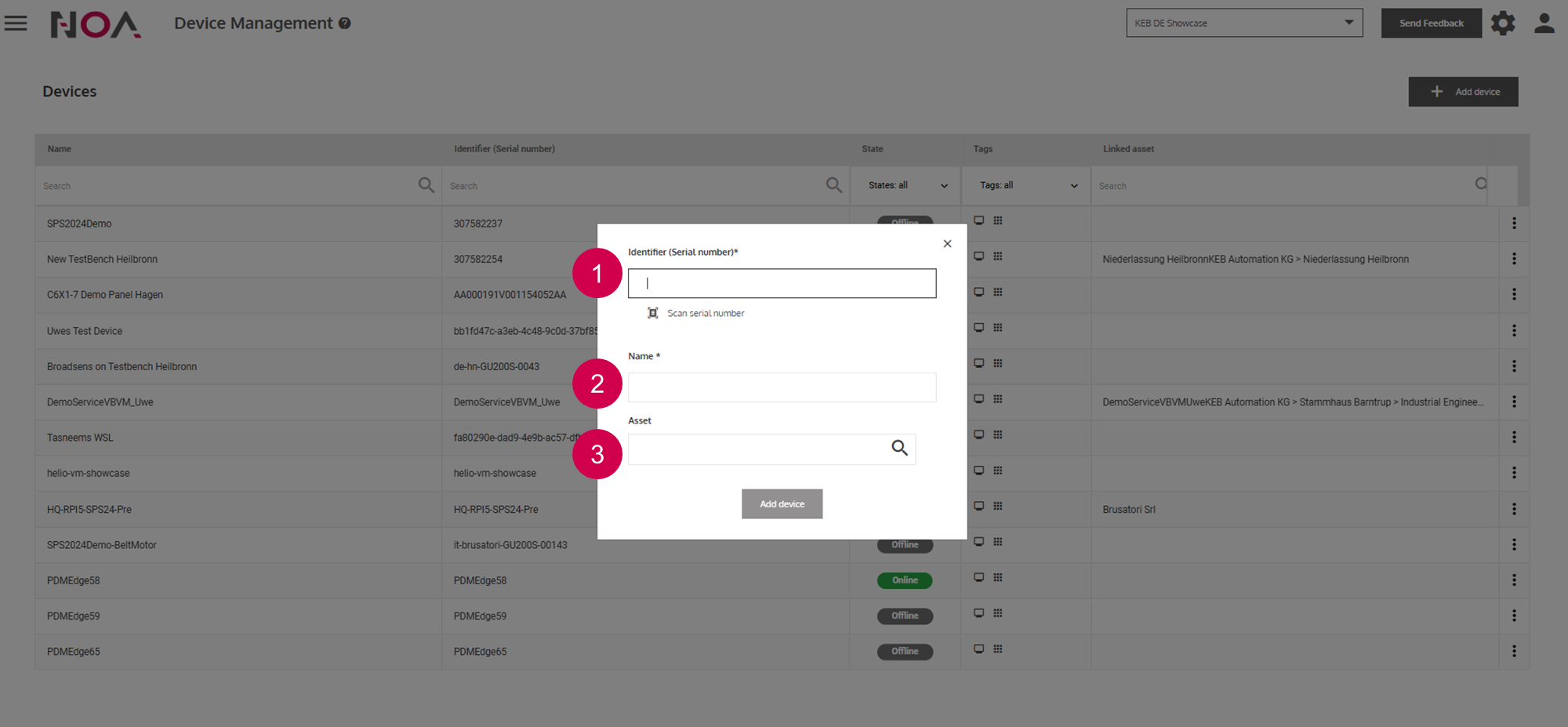 Adding a Device means registering it to your Tenant. After that, you can manage it in NOA Portal.